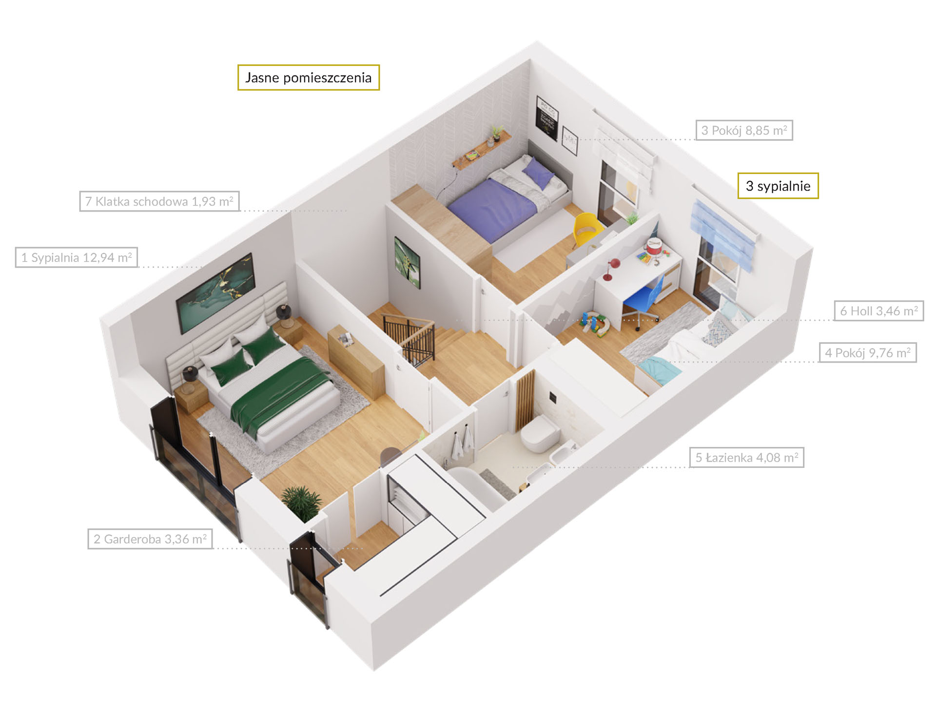 W projekcie zastosowano duże przeszklenia o podwyższonej termice, dzięki czemu wnętrza są pełne naturalnego światła, przy jednoczesnym ograniczaniu strat ciepła. Na każdym domu zamontowano wysokiej klasy panele fotowoltaiczne, które w połączeniu z wydajną pompą ciepła, ogrzewającą wnętrza budynków, stanowią niezawodne, ekologiczne rozwiązanie. Za dopływ świeżego powietrza do pomieszczeń odpowiada rekuperacja. Wszystko to obniża koszty użytkowania domów, gwarantuje zdrowe warunki do życia i ogranicza oddziaływanie człowieka na środowisko. zwiń ∧