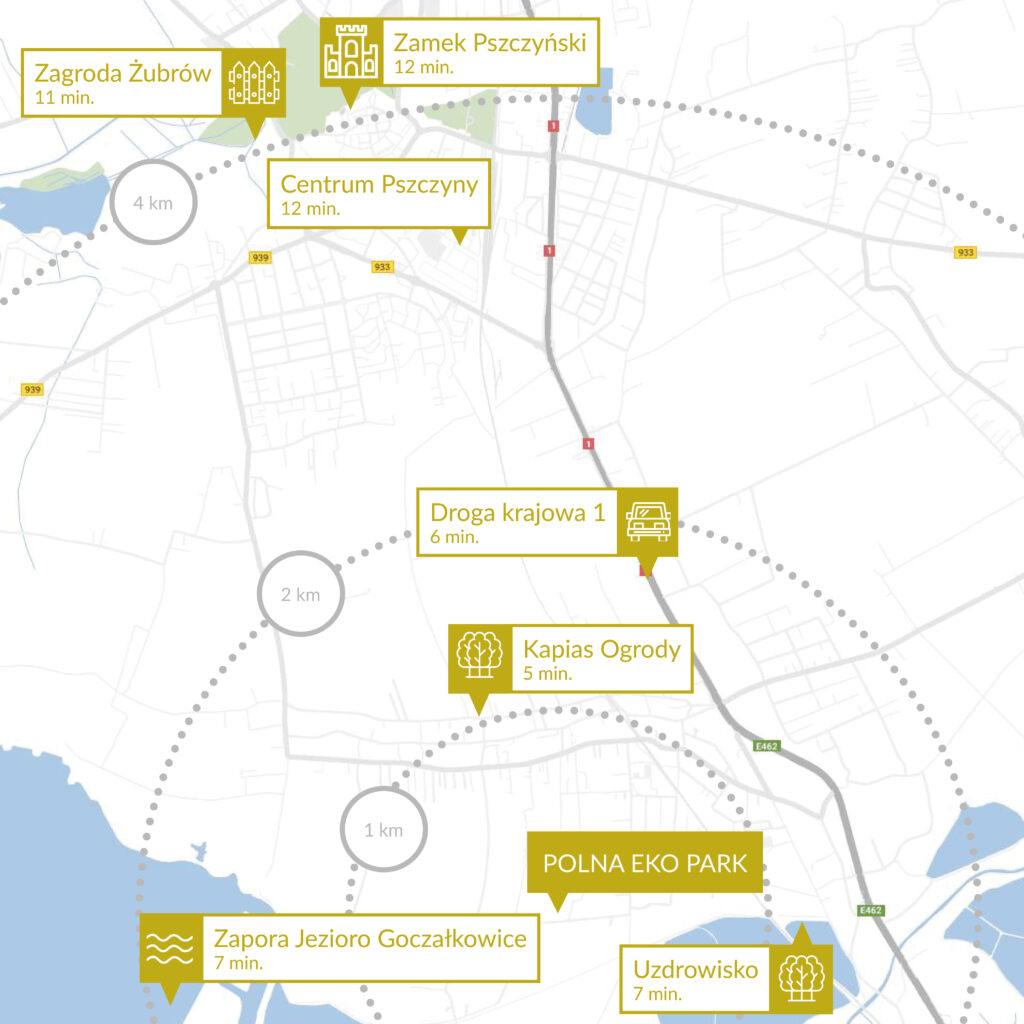 Osiedle Polna Eko Park znajduje się przy ul. Polnej w Goczałkowicach-Zdroju, czyli popularnym śląskim uzdrowisku. Jedną z najważniejszych zalet tej lokalizacji jest bliskość natury. Malownicza okolica jest pełna zieleni. Panuje w niej spokój i błoga cisza. Niedaleko do kilku urokliwych stawów, zalesienia, Zapory na Jeziorze Goczałkowickim, Parku Zdrojowego, Ogrodów Kapias, Zamku w Pszczynie, Zagrody Żubrów oraz uzdrowiska. Łatwo więc można zorganizować swój czas wolny.