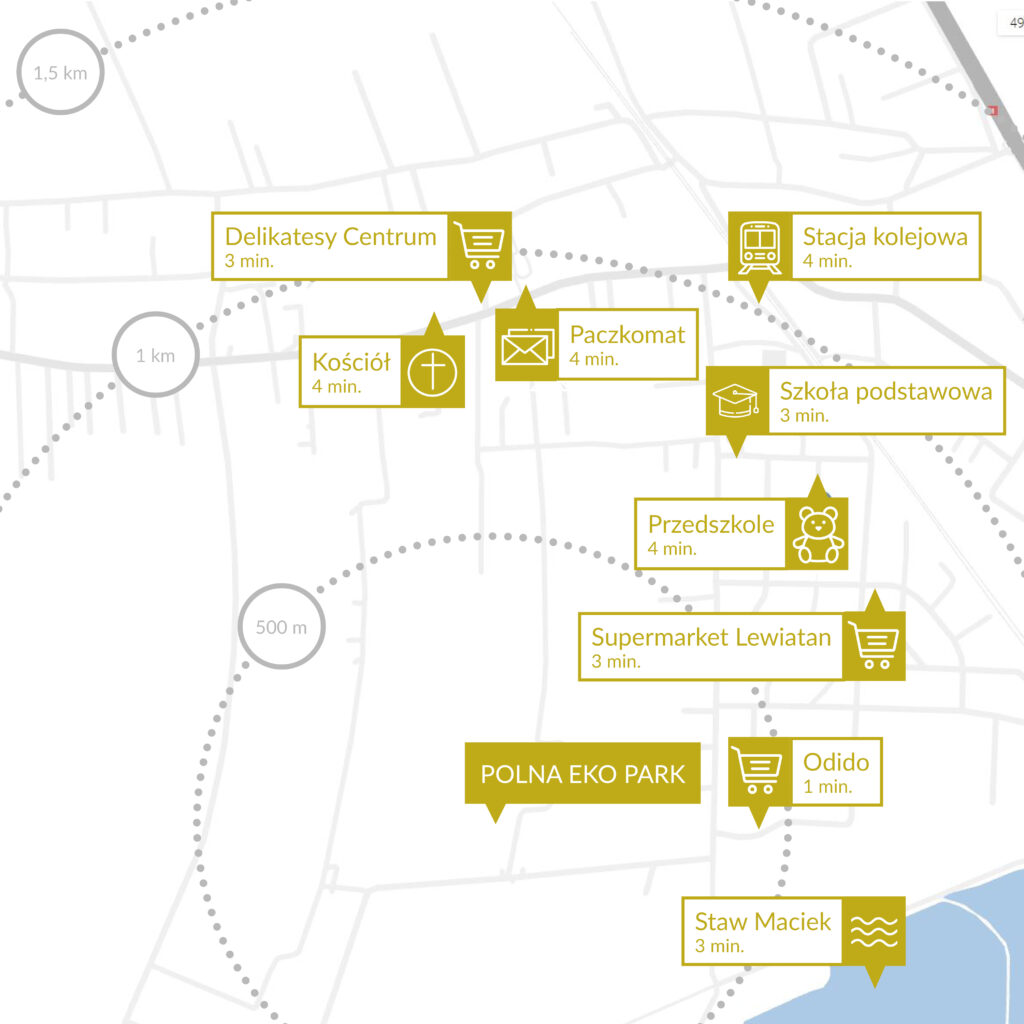 W promieniu 2 km mieści się m.in.: szkoła podstawowa, przedszkole, kryty basen, kościół, przychodnia, apteka, stacja kolejowa, restauracja i paczkomat. Komfortowo można planować codzienną logistykę, robić zakupy dla całej rodziny oraz załatwiać pilne sprawy. zwiń ∧
